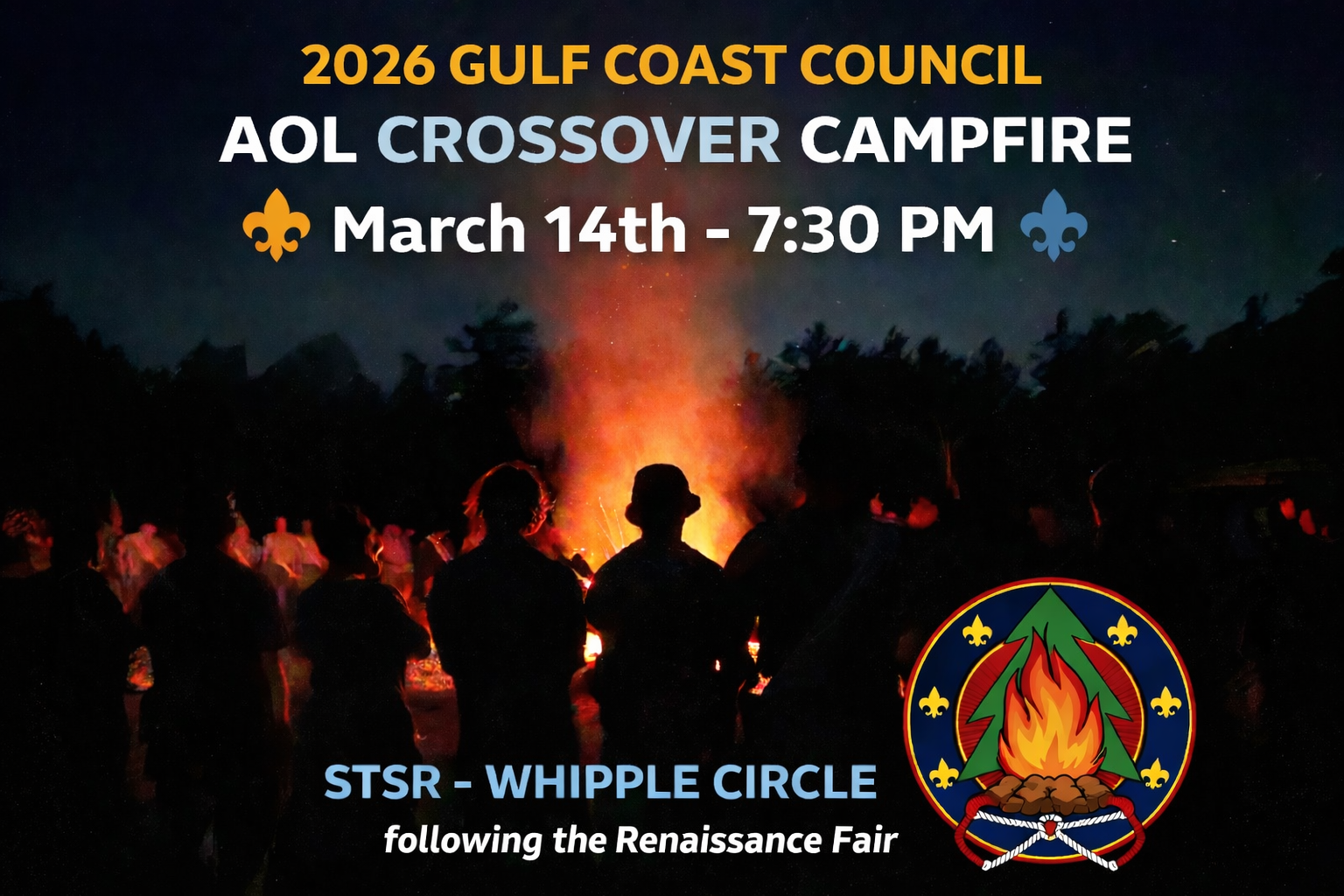 Arrow of Light Scouts from across Gulf Coast Council are invited to cross the bridge at the closing campfire of the Inaugural STSR Renaissance Fair. Saturday, March 14 at 7:30 PM at Whipple Circle — free to register, open to all GCC AOL Scouts ready to cross over. Registration closes March 12.